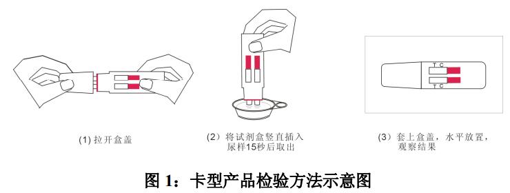 4. 盒型:拉開(kāi)盒蓋,將試劑盒豎直插入尿樣中(如圖,注意尿樣不要沒(méi)過(guò)紅線(xiàn)),同時(shí)開(kāi)始計(jì)時(shí),15 秒后取出并套上盒套,觀察窗向上放置在水平臺(tái)面上。